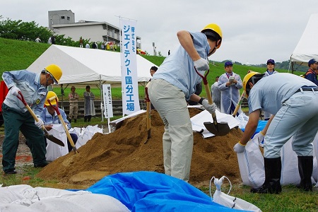 演習には国土交通省のほか、大阪府、大阪市や水防団、警察、自衛隊などに加え地元企業、大学などの多様な機関が参加し、見学者を含め約1,500人の演習となりました。