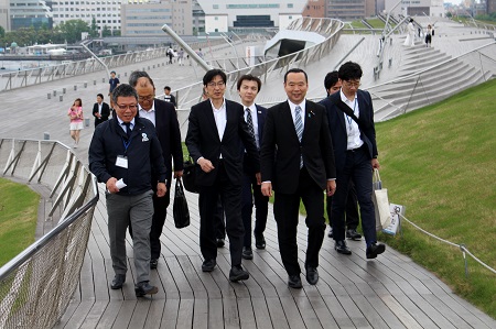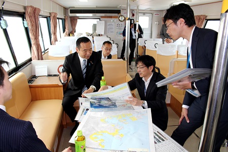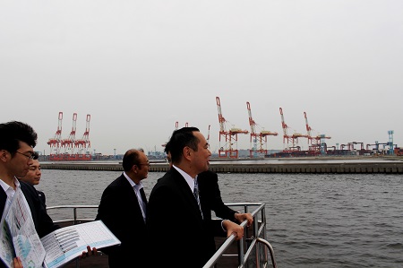 藤井政務官は、港湾業務艇「たかしまII」に乗船し、海上から、山下ふ頭、本牧ふ頭、南本牧ふ頭、大黒ふ頭、ベイブリッジ、東京湾中央航路等を視察した後、大さん橋ふ頭において国際客船ターミナルの現況を視察しました。