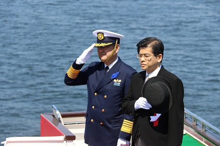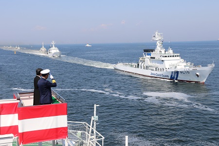編隊航行訓練で受閲巡視船に答礼を行う石井大臣