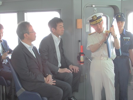 巡視艇「まつなみ」に乗船して説明を受ける田中副大臣
