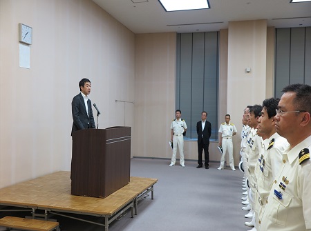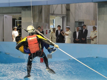 その後、横浜海上防災基地では特殊救難隊による展示訓練、海上保安資料館を視察し、第三管区海上保安本部では職員に対し激励を行いました。