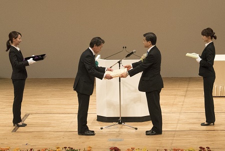 同式典においては、第28回「みどりの愛護」功労者国土交通大臣表彰の表彰式が行われ、受賞された133団体の代表に対し、石井大臣より感謝状が授与されました。