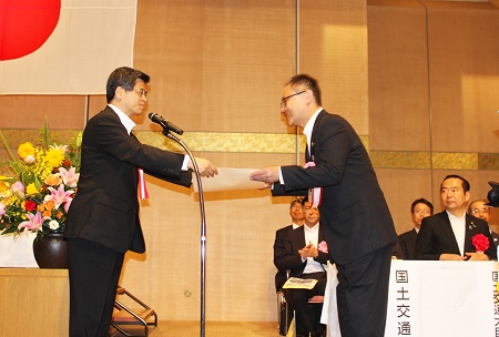 続く第29回全国街路事業コンクール表彰式では、国土交通大臣賞を受賞した東京都(東京都市計画道路幹線街路環状2号線(新橋・虎ノ門間)整備事業)に、賞状と記念品の盾が大臣より手渡されました。