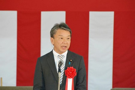 式典にて挨拶する大野政務官