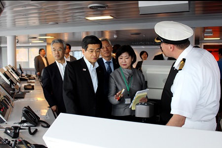 横浜港大黒ふ頭に着岸した「マジェスティック・プリンスセス」では、今年3月に就航したばかりのプリンセス・クルーズ社の最新鋭のクルーズ船内の操舵室、客室、シアター、カジノ、レストラン等を視察しました。