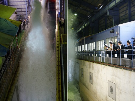 人工的に発生させた津波が構造物に衝突する様子を