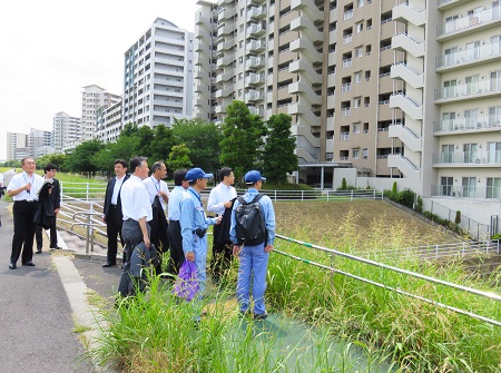 平井7丁目地区高規格堤防を視察する石井大臣