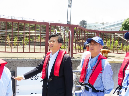 旧中川と、荒川本川の水位差を体感する石井大臣