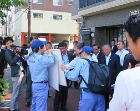 石井大臣は、荒川、隅田川を視察し、首都圏のゼロメートル地帯※における大規模水害時の被害想定や周囲を防護する高規格堤防(スーパー堤防)、水門などの施設について説明を受けました。