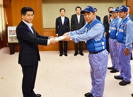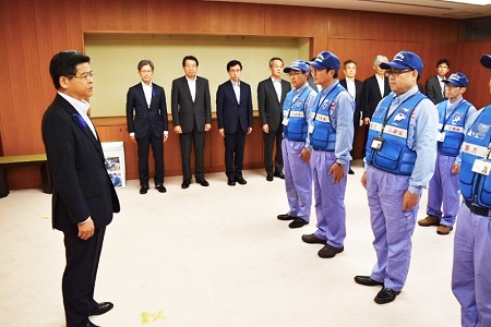 TEC-FORCE隊員から活動報告を受け取る石井大臣