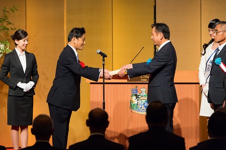 平成29年7月19日(水)、兵庫県神戸市内にて「海フェスタ神戸」記念式典が、秋篠宮殿下及び同妃殿下のご臨席のもとで開催されました。記念式典には、末松副大臣及び藤井政務官が出席し、末松副大臣から神戸港の開港150周年に触れて祝辞を述べるとともに、海事関係功労者表彰を執り行い、国土交通大臣賞の受賞者に対して表彰状を授与しました。