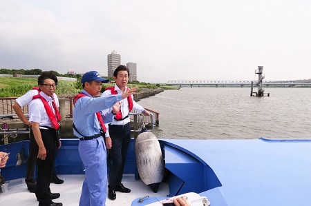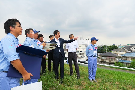 田中副大臣は、埼玉県川口市で開催された県南七市治水大会(県南治水促進期成同盟会)に出席しました。大会に先立ち、都市機能が集中する荒川流域を災害から守る治水事業を 視察し、堤防整備や荒川第一調節池(彩湖)などの事業について説明を受けました。