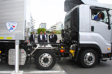 スワップボディ車両について説明を受ける根本政務官