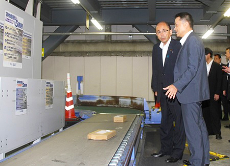 仕分け作業について説明を受ける根本政務官