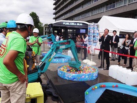 ショベルカー体験を視察する藤井政務官