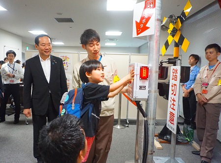 踏切の非常ボタン体験を視察する藤井政務官