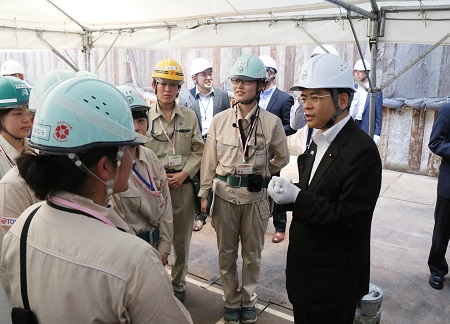 石井大臣は、「虎の門病院整備事業」で開催された「けんせつ小町活躍現場見学会」を視察し、見学会に参加した子供たちと懇談するとともに、「けんせつ小町」の皆さんを激励しました。