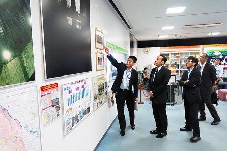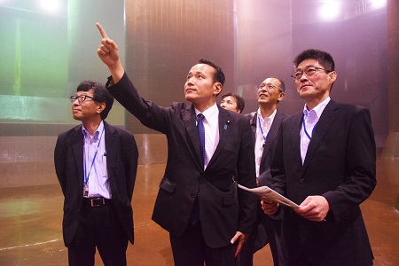 首都圏外郭放水路の仕組みの説明を受ける簗政務官