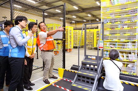 また、アマゾン川崎フルフィルメントセンターでは、アマゾンジャパン合同会社が国内で初めて導入した、センター内を自律移動し商品を運搬するロボット「Amazon Robotics」等を視察し、商品の入荷から出荷までの庫内作業の効率化に関する取組について説明を受けるとともに、商品の棚出し作業を体験しました。