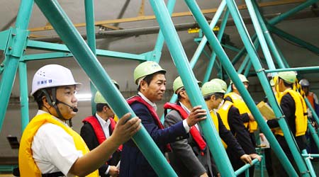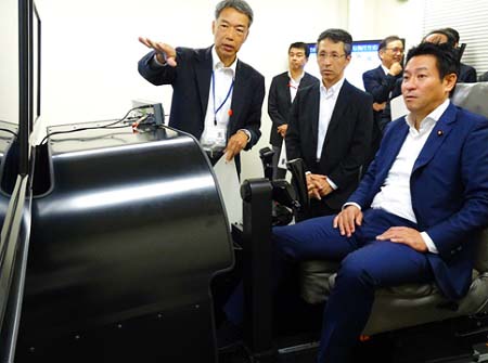 操船リスクシミュレータの説明を受ける秋元副大臣