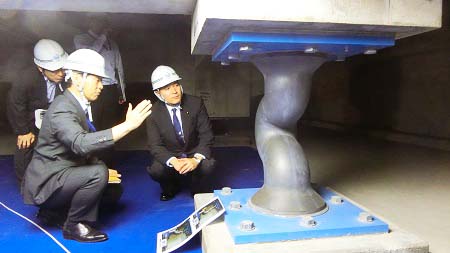 地震発生時に本部棟の揺れを減衰する鉛ダンパーの視察