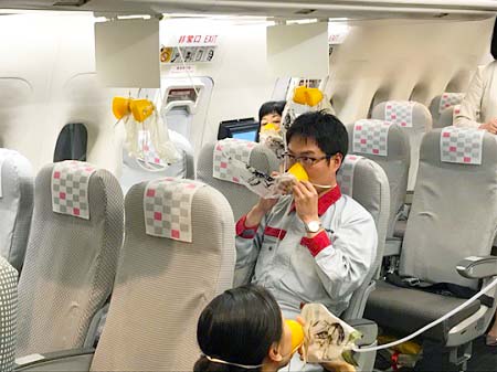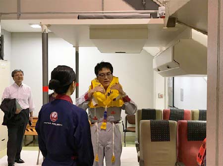 滑り台を用いた脱出や救命胴衣の着脱、酸素マスクを着用した急減圧デモンストレーションを視察したほか、爆発物が機内に持ち込まれた事案を想定した訓練に参加するなど、乗務員向け非常時対応訓練の実施状況を確認しました。