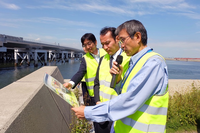 D滑走路の桟橋構造について説明を受ける簗政務官