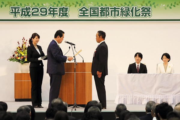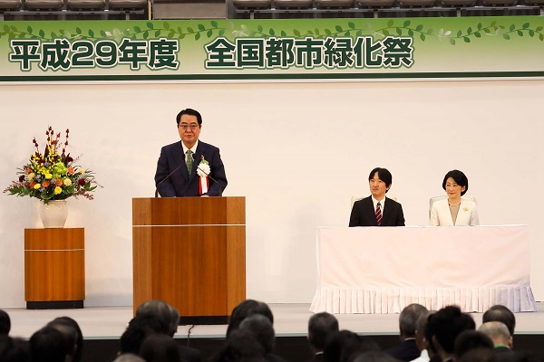 平成29年9月20日(水)、東京都八王子市「富士森体育館」において平成29年度全国都市緑化祭が秋篠宮同妃両殿下のご臨席のもと開催され、牧野副大臣が出席しました。