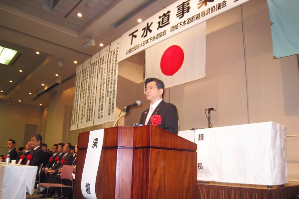 来賓として挨拶した石井大臣は、「人口減少等に伴う厳しい経営環境、執行体制の脆弱化、施設の老朽化などの課題が一層進んでいる中、下水道の持続性向上のためにも、国土交通省として下水道予算の確保も含め努力をして参ります。」と述べました。