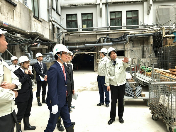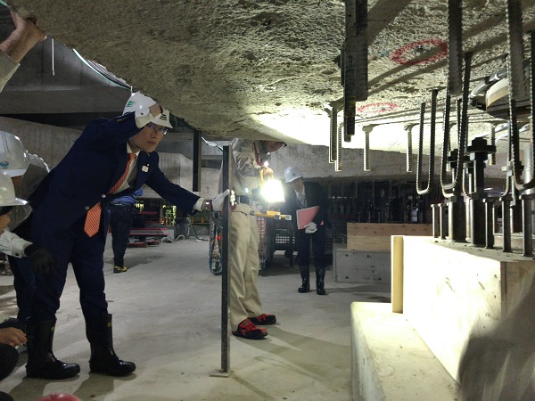 工事概要について説明を受け、執務への影響が最小限となるよう配慮して工事を実施している状況や、免震装置の設置状況などを視察しました。