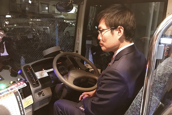 EVバス車内を視察する秋本政務官