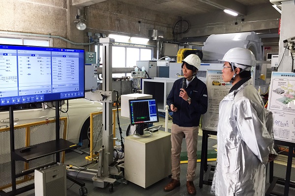 シャシダイナモメータの説明を受ける秋本政務官