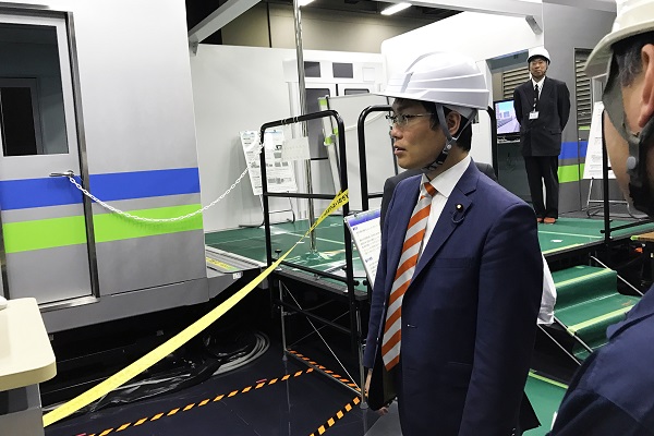 列車運行システム安全性評価シミュレータを視察する秋本政務官