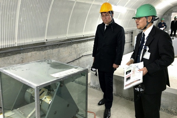 大坑道前で観測所の建設経緯の説明を受ける秋本政務官
