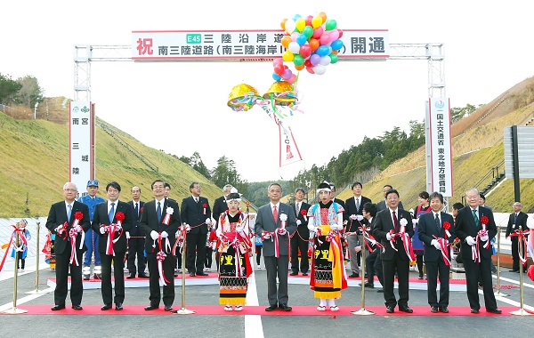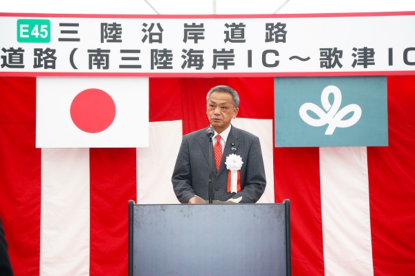高橋政務官は、式典において、「本日の開通により、津波浸水区域を回避することが可能となるほか、アクセス性が向上し、観光活性化や、地域の基幹産業である水産業の振興にも大きく貢献することが期待される。引き続き、復興道路、復興支援道路の平成32年度までの全線開通を目指し、事業を推進していく」と挨拶しました。