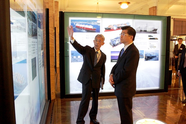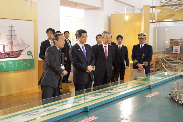 日本郵船歴史博物館において説明を受ける石井大臣
