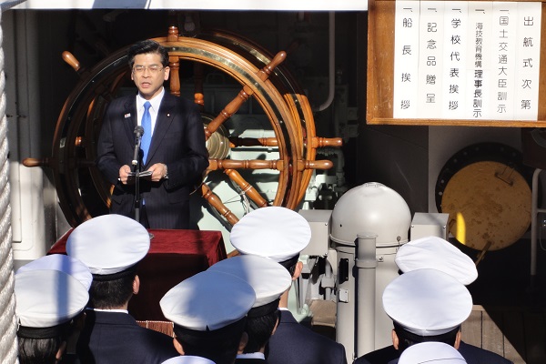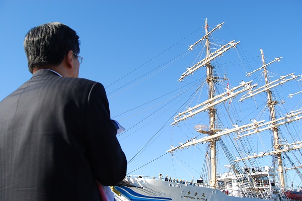 石井大臣は、横浜港に停泊中の練習帆船「日本丸」船上で行われた遠洋航海出航式に出席しました。