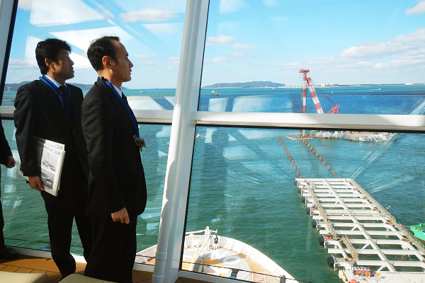 博多港においては、中央ふ頭地区において、クルーズ船寄港の増加・大型化に対応した岸壁の整備状況やクルーズ船クァンタム・オブ・ザ・シーズの船内、また、アイランドシティ地区及び香椎パークポート地区において、物流拠点であるコンテナターミナルの状況について視察しました。