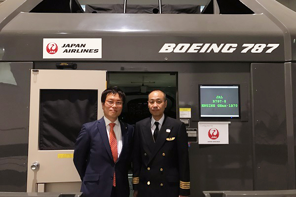 秋本政務官は、日本航空株式会社の運航乗務員訓練施設を訪れ、BOEING787型機のフライトシミュレーターを用いた訓練概要について説明を受けました。