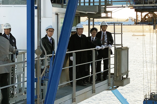 新興津コンテナターミナルのガントリークレーンを視察する牧野副大臣