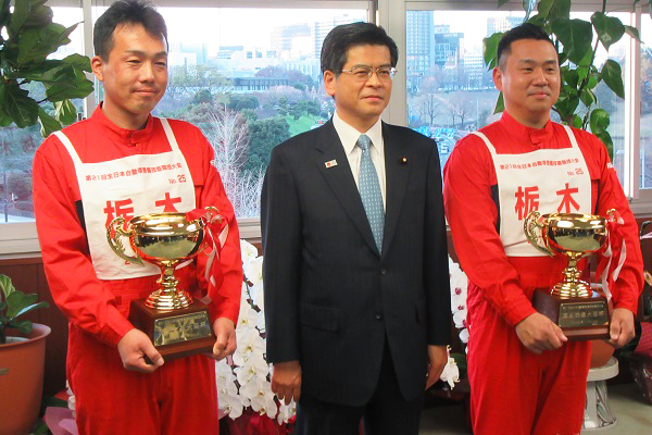 日本自動車整備振興会連合会主催により、東京都内で開催された第21回全日本自動車整備技能競技大会の優勝チームへの国土交通大臣杯授与式が、国土交通大臣室にて行われ、栃木県代表チームの塩田 雄基さん、須永 圭則さんそれぞれに、石井大臣から賞状と国土交通大臣杯が授与されました。