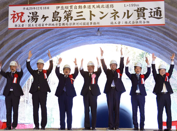牧野副大臣は、式典において「今回の貫通は天城北道路の平成30年度の開通に向けた大きな一歩。伊豆地域の観光振興や渋滞緩和、防災、医療活動に寄与する伊豆縦貫自動車道の整備に全力で取り組んでまいります。」と挨拶しました。