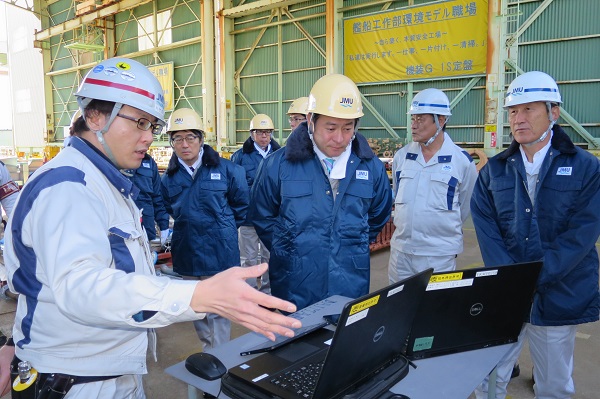 ジャパン マリンユナイテッド(株)では、国土交通省が海事生産性革命として推進する「i-Shipping」への同社の取組みにつき技術開発現場において説明を受けるとともに、ODAでフィリピンに供与する予定の巡視船の建造状況等を視察しました。