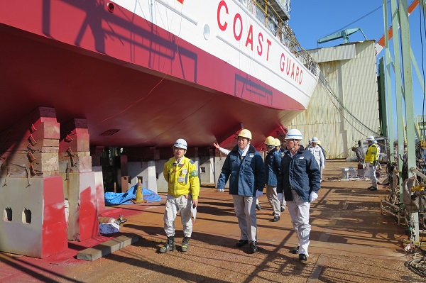 建造中のフィリピン向け巡視船を視察するあきもと副大臣