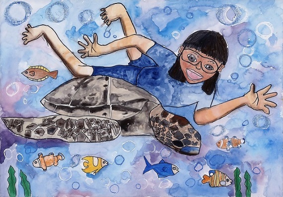 石井大臣から「海ガメを愛しんでいる絵画ですね。海の色も青だけではなく、色々な色で表現していてとても良いですね。」と西里さんにその作品への思いが伝えられると、西里さんは「はい。海ガメも宮古島の海も大好きです。」と、満面の笑みで喜んでいました。