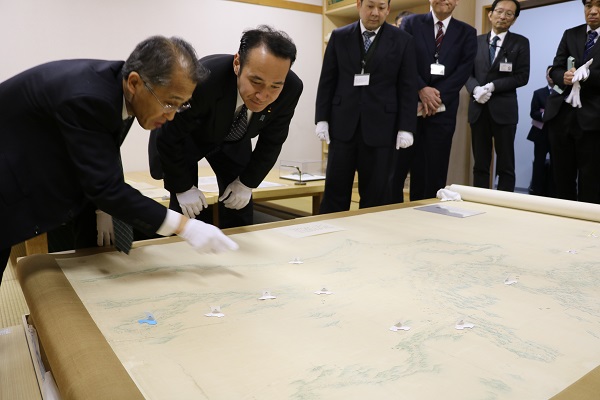歴史的に貴重な地図資料について説明を受ける簗政務官