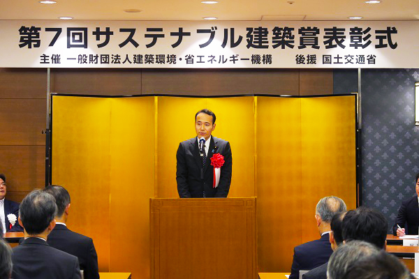 簗政務官は挨拶の中で、「本日受賞された建築物は、いずれも環境負荷低減を実現した大変優れたプロジェクトであり、我が国のサステナブル建築を先導するモデルとなるものです。受賞者の皆様におかれましては、今後とも、さらなるサステナブル建築の普及・推進にご尽力頂けますよう、お願い申し上げます。」と述べました。