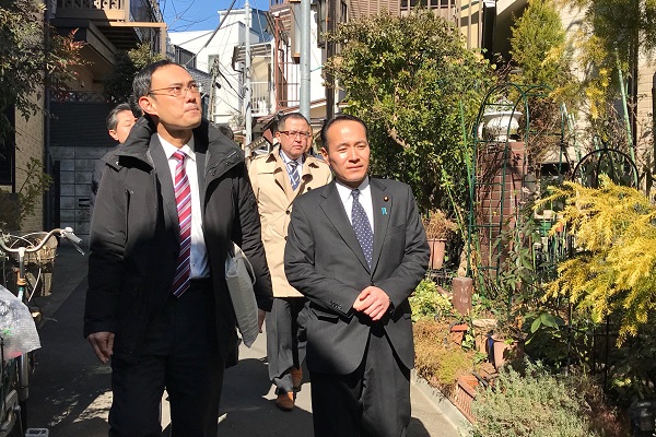 品川区の二葉地区において、密集市街地内の狭隘道路を視察する簗政務官