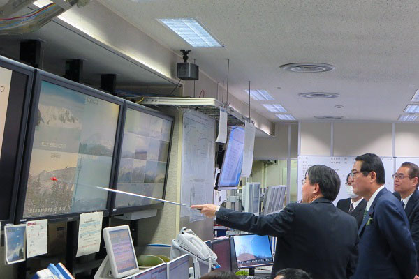 地震火山現業室で説明を受ける牧野副大臣