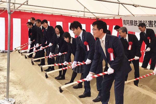 南阿蘇鉄道災害復旧工事着工式で鍬入れをする秋本政務官